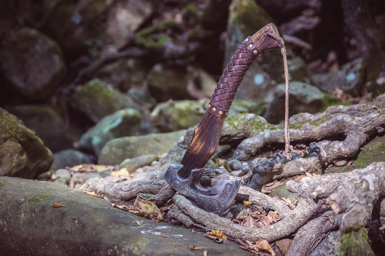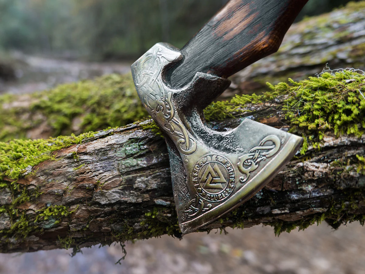Vikingayxan är det vapen som användes mest av vikingarna. Denna handgjorda yxa är graverad med traditionella vikingamotiv i prestigefyllt kolstål, så den kommer att hålla i över 100 år.